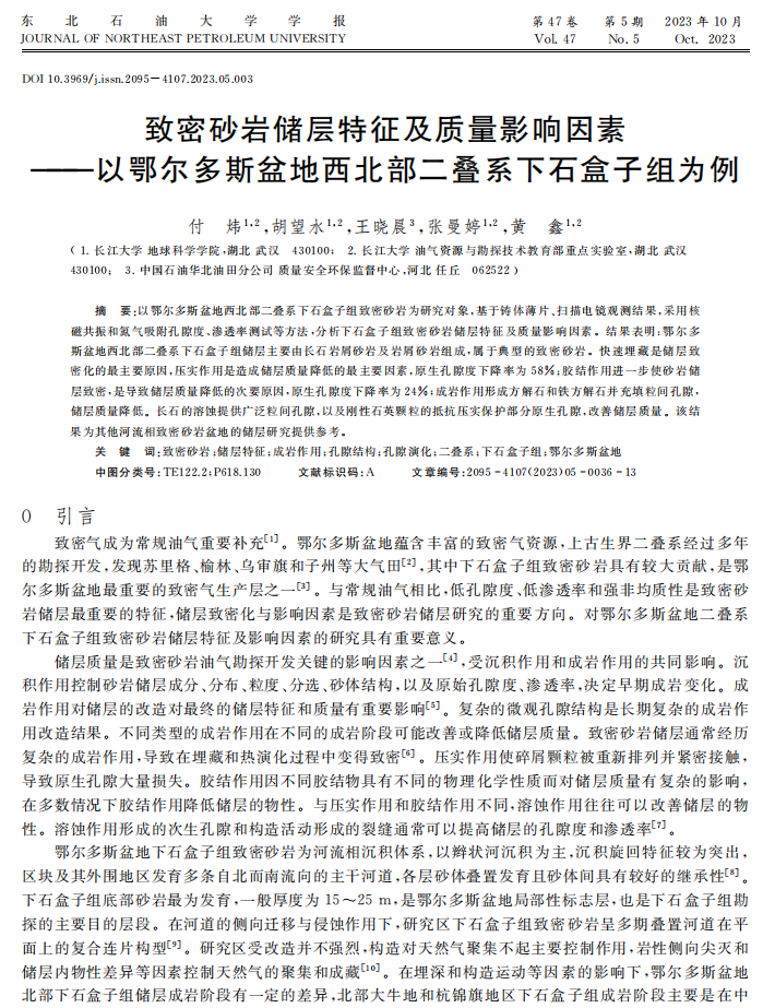 87978797威尼斯老品牌博士生付炜在期刊《东北石油大学学报》上发表题为“致密砂岩储层特征及质量影响因素———以鄂尔多斯盆地西北部二叠系下石盒子组为例”的研究论文。87978797威尼斯老品牌为论文第一署名单位,胡望水教授为通讯作者,本项研究得到国家自然科学基金重点项目项目资助。
