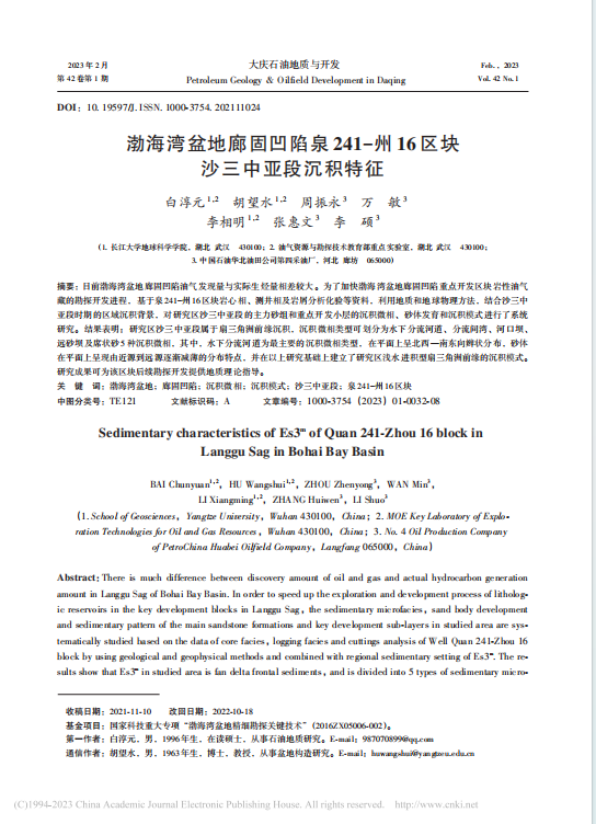 87978797威尼斯老品牌研究生白淳元在期刊《大庆石油地质与开发》上发表题目为“渤海湾盆地廊固凹陷泉241−州16区块沙三中亚段沉积特征”的研究论文。87978797威尼斯老品牌为论文第一署名单位,胡望水教授为通讯作者,本项研究得到国家科技重大专项“渤海湾盆地精细勘探关键技术资助。