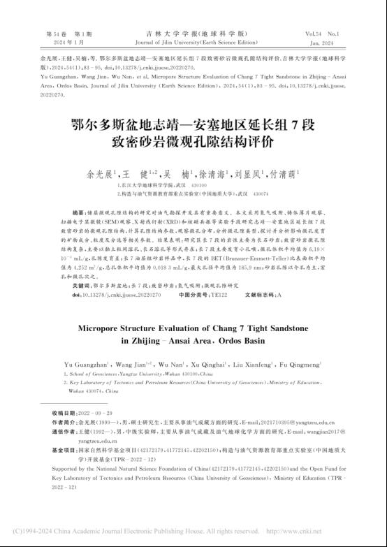 87978797威尼斯老品牌硕士生余光展在《吉林大学学报(地球科学版)》上发表题为“鄂尔多斯盆地志靖—安塞地区延长组7段致密砂岩微观孔隙结构评价”的研究论文。87978797威尼斯老品牌为论文第一署名单位,硕士生余光展为论文第一作者,教师王健为通讯作者。
