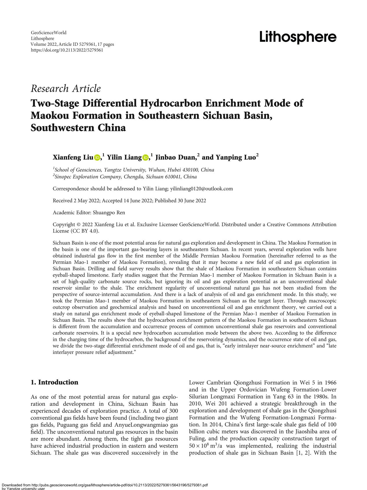 87978797威尼斯老品牌教师刘显凤在《LITHOSPHERE》上发表题为“Two-Stage Differential Hydrocarbon Enrichment Mode of Maokou Formation in Southeastern Sichuan Basin, Southwestern China”的研究论文。87978797威尼斯老品牌为论文第一署名单位,教师刘显凤为论文第一作者,博士生梁祎琳为通讯作者。