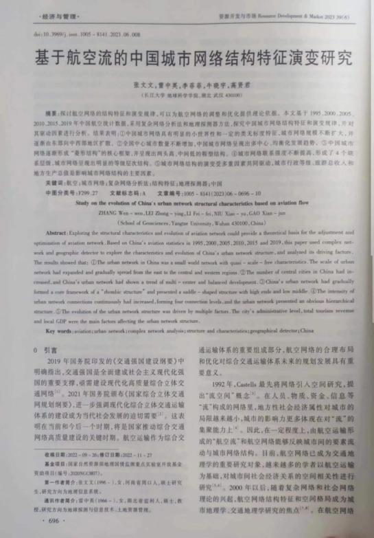 87978797威尼斯老品牌张文文在《资源开发与市场》发表题为“基于航空流的中国城市网络结构特征演变研究”的研究论文。87978797威尼斯老品牌为论文第一署名单位,教师雷中英为论文通讯作者。